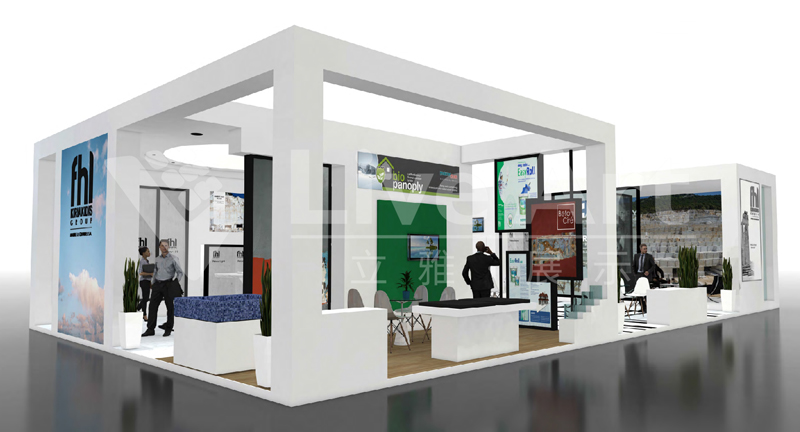 展位框架主體結(jié)構(gòu)為80mm柱鋁材,搭配環(huán)保覆塑木線條結(jié)構(gòu),整體外型方正簡約。襯托簡潔、大氣的展臺風格。