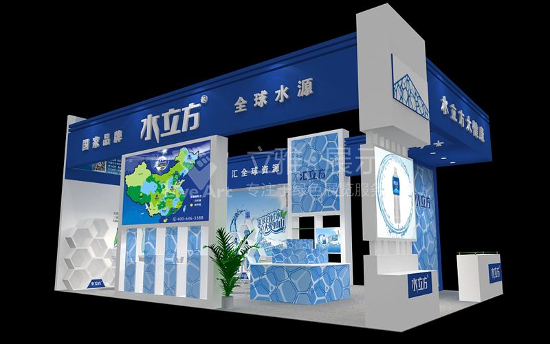 水立方礦泉,是一家集優(yōu)質(zhì)飲用水開發(fā)定制、生產(chǎn)與銷售于一體的企業(yè)。本次展位設計采用藍色為主色調(diào),輔以水立方形象商標,體現(xiàn)品牌天然、純凈、自然的本色。