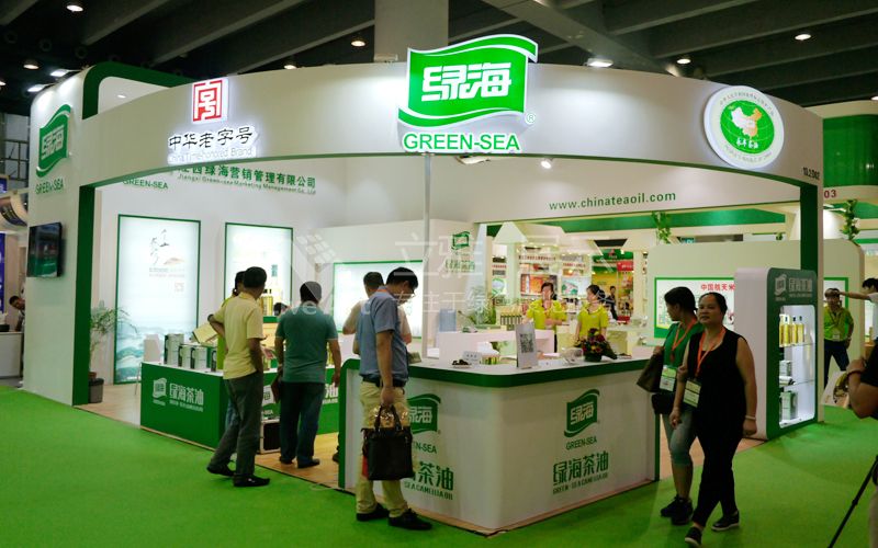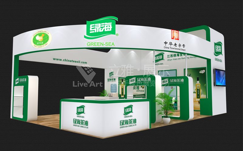 綠海,契合企業(yè)健康飲食的形象,以白色結(jié)合綠色設計展位,弧形門頭設計,視覺呈現(xiàn)半圓效果,簡潔干凈的風格。讓人留下健康清新的印象。
